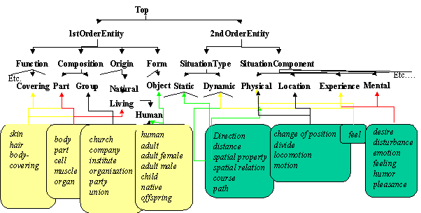 The EuroWordNet top-ontology is a lattice structure of 63 features that can be combined in feature combinations (see next Figure). The ontology is specifically designed to help the encoding of the lexical semantic relations in the wordnet in a uniform way. Concrete synsets are classified as 1stOrderEntities that can be specified for 4 Qualia Roles (Pustejovsky 1995): Origin, Form, Composition and Function, e.g.: vehicle is classified as Artifact (Origin) + Object (Form) + Vehicle (Function). Abstract synsets can be 3rdOrderEntities (propositions, ideas, knowledge) or 2ndOrderEntities (events, states, relations). The latter are further classified according to the Aktions-Art class (SituationType: Dunamic or Static)or one or more SituationComponents: Cause, Experience, Mental, Physical, Location, Purpose, Communication, etc. Each 2ndOrder synset has 1 SituationType and a combination of SituationComponents, e.g.: change location is classified as Dynamic + Location + Agentive (Cause) + Physical. A further explanation and motivation of this ontology is given in the EuroWordNet WWW-site.