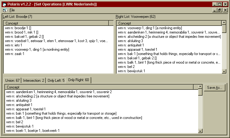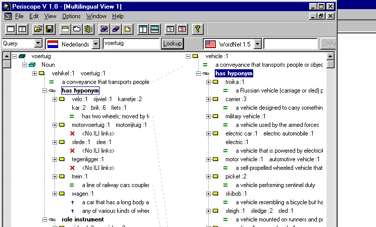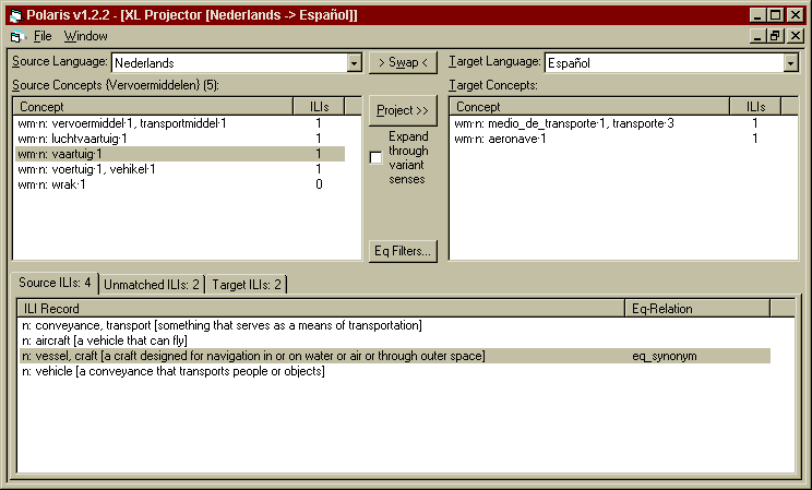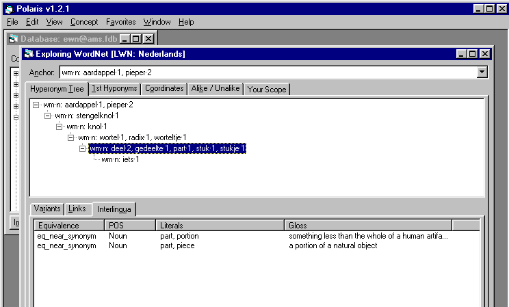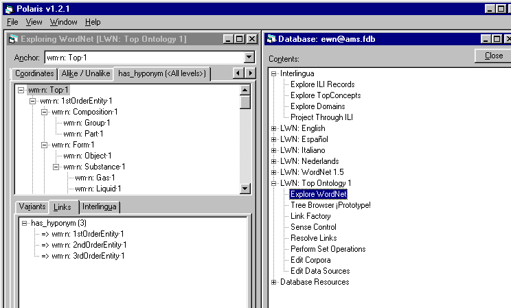 The Polaris tool is a re-implementation of the Novell ConceptNet toolkit (Díez-Orzas et al 1995) adapted to the EuroWordNet architecture. Polaris can import new wordnets or wordnet fragments from ASCII files with the correct import format and it creates an indexed EuroWordNet database (an example of the import format is the Top Ontology file). Furthermore, it allows a user to edit and add relations in the wordnets and to formulate queries. The Polaris toolkit makes it possible to visualize the semantic relations as a tree-structure that can directly be edited. These trees can be expanded and shrunk by clicking on word-meanings and by specifying so-called TABs indicating the kind and depth of relations that need to be shown. Expanded trees or sub-trees can be stored as a set of synsets, which can be manipulated, saved or loaded. Additionally, it is possible to access the ILI or the ontologies, and to switch between the wordnets and ontologies via the ILI. Polaris can be licensed from Lernout and Hauspie in Antwerp or from ELRA. Finally, it contains a query interface to match sets of synsets across wordnets.