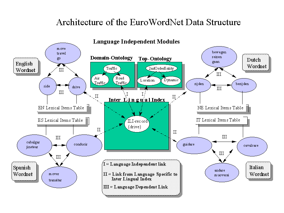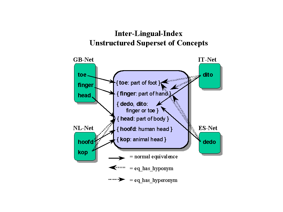 In this picture you see that the ILI has been extended with concepts not occurring in English or WordNet1.5, whereas complex equivalence relations are expressed to the more general or more specific English concepts: eq_has_hyponym and eq_has_hyperonym.