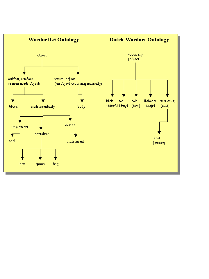 available documents. The top-ontology can be down-loaded for free.The design of EuroWordNet makes it possible to precisely describe the lexicalization of a language given a conceptual space. What this implies is best illustrated with an example. Consider, for example, all the words that are related to body parts. All the wordnets will share the top-ontology concepts Part and Living but each language has different lexicalizations for body parts. Whereas English words like head and leg can name the same parts of animals and humans, in Dutch different words are used for animal parts and humans parts (kop (head) and poot (leg) for all animals except horses and hoofd (head) and been (leg) for humans and horses respectively). Similarly, in English and Dutch there are different words for finger and toe whereas Italian and Spanish have a single word to name both types of body parts (dito and dedo respectively):