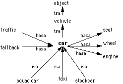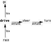 Princeton WordNet (Miller et al 1990). The American WordNet database consists of semantic relations between English word meanings (so-called synsets) which can be accessed as a kind of thesaurus in which words with related meanings are grouped together. For example, a noun like car is linked to, among others, all words that have a hyponymy or isa relation or a meronymy or hasa relation with it, and a verb like drive to, among others, all words that have a hyponymy or an entailment relation with it:Relations for "drive" and "car"