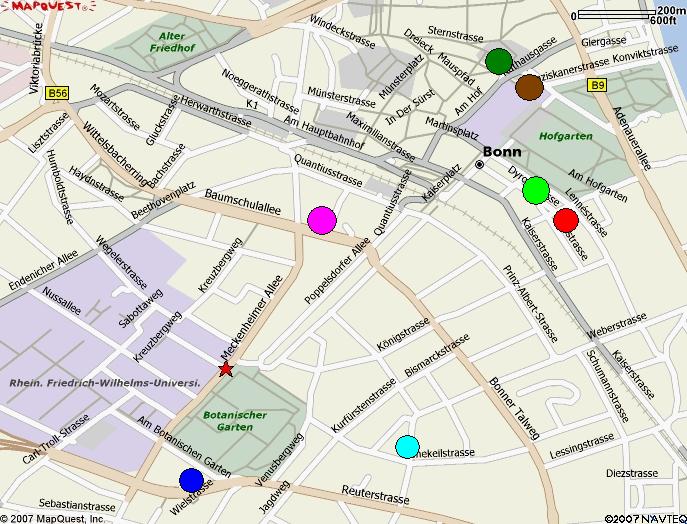 The invited speakers will be staying in the Hotel Eden Am Hofgarten (Am Hofgarten 6, +49-(0)228/289710) which is within walking distance of both workshop locations. It is marked on the map below by a LIGHT GREEN circle. The rooms for the invited speakers are booked and paid for by the organizers. All other participants need to arrange their accommodation themselves. Other hotels within walking distance of the workshop sites are: