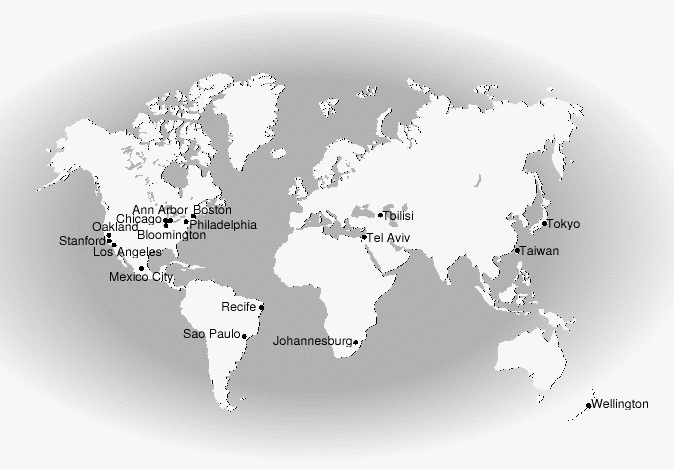 Logic Actions in the WorldOutside of Europe, the contacts of the Logic in Action project can be found mainly in the United States, but not exclusively. We have indicated our main contacts on the map below. Stanford deserves to be mentioned especially. The Center for the Study of Language and Information from Stanford University is a sister institute of the ILLC, and Johan van Benthem, holding the Bonsall visiting chair of humanities, spends his spring quarters there. A global link to the world of logic is the Association of Symbolic logic (ASL)).